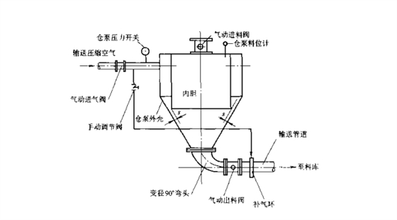 當(dāng)L型倉泵裝料達(dá)到預(yù)先設(shè)定的高料位時(shí),料位計(jì)發(fā)出輸出信號(hào),關(guān)閉氣動(dòng)進(jìn)料閥,開啟L型倉泵氣動(dòng)進(jìn)氣閥。